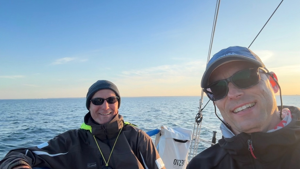 Es folgte der Start zum Neustädter Sonnenschuss bei ebenfalls schönem Wetter, mit der Prognose eines sehr schwachwindigen Abends samt Nacht. Zunächst ging es jedoch mit großen Schritten in Richtung Staberhuk, wo die Entscheidung zu fällen war, in welcher Richtung man die Insel Fehmarn umsegeln wollte. Nach vielen Routingdurchläufen haben wir uns für den Uhrzeigersinn entschieden. Mit langsam nachlassendem Wind ging es wie im letzten Jahr gemeinsam mit der J88 JoJo kreuzend erst durch die Brücke, dann zur Einfahrt nach Heiligenhafen, um dann bei der Tonne 2 wieder abfallen zu können.