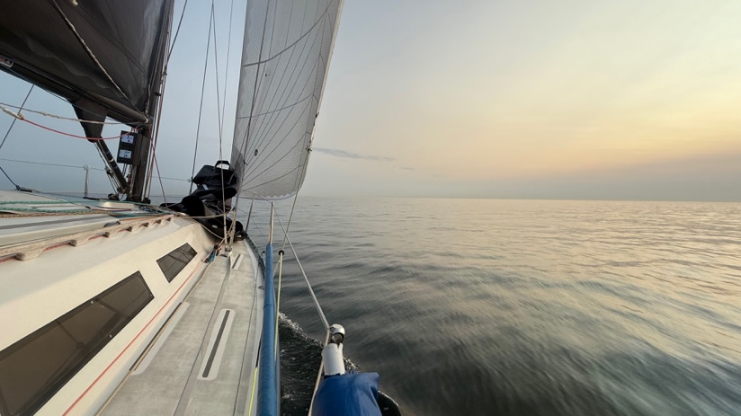 Der Wind war zu diesem Zeitpunkt gegen 18 Uhr schon sehr mau. Erschreckenderweise kam uns zu diesem Zeitpunkt bereits der Führende von der Gruppe der Gegen-den-Uhrzeigersinn-Segelnden entgegen. Spannenderweise waren wir im Soll unseres Routings, und auch auf Gegenkurs wären wir zu dieser Zeit auch ungefähr an der gleichen Stelle gewesen. Es sollte also spannend werden, wer zuerst wieder bei Staberhuk ankommt. Kurz nach Mitternacht, nach vielen Segelwechseln und Schiften wurde unsere Kursentscheidung belohnt. Wir waren vor dem anderen Feld wieder bei der Tonne Staberhuk angekommen. Von dort aus ging es über Wismar wieder nach Neustadt zurück. Leichter Wind, herrlicher Sonnenaufgang querab von der Insel Poel und ein Zieleinlauf um 9.30 unter Spi – „Bilderbuch Segeln“.
