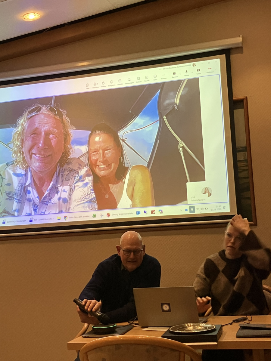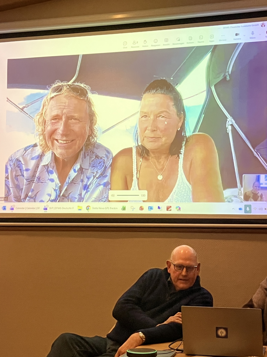 Ein weiterer Höhepunkt des Abends war ein live-chat zu unseren SVT-Langfahrern Peter Kamps und Freundin Silvi. Lisa schaltete live, Silvi und Peter berichteten von ihrem Törn vom SVT in die Karibik. Der Vortrag lief, dank Starlink, über unseren SVT-Beamer, von der Stella Nova unter karibischer Sonne live von Peter kommentiert.