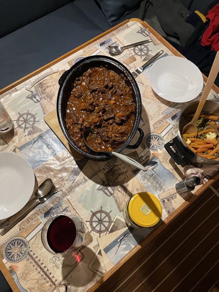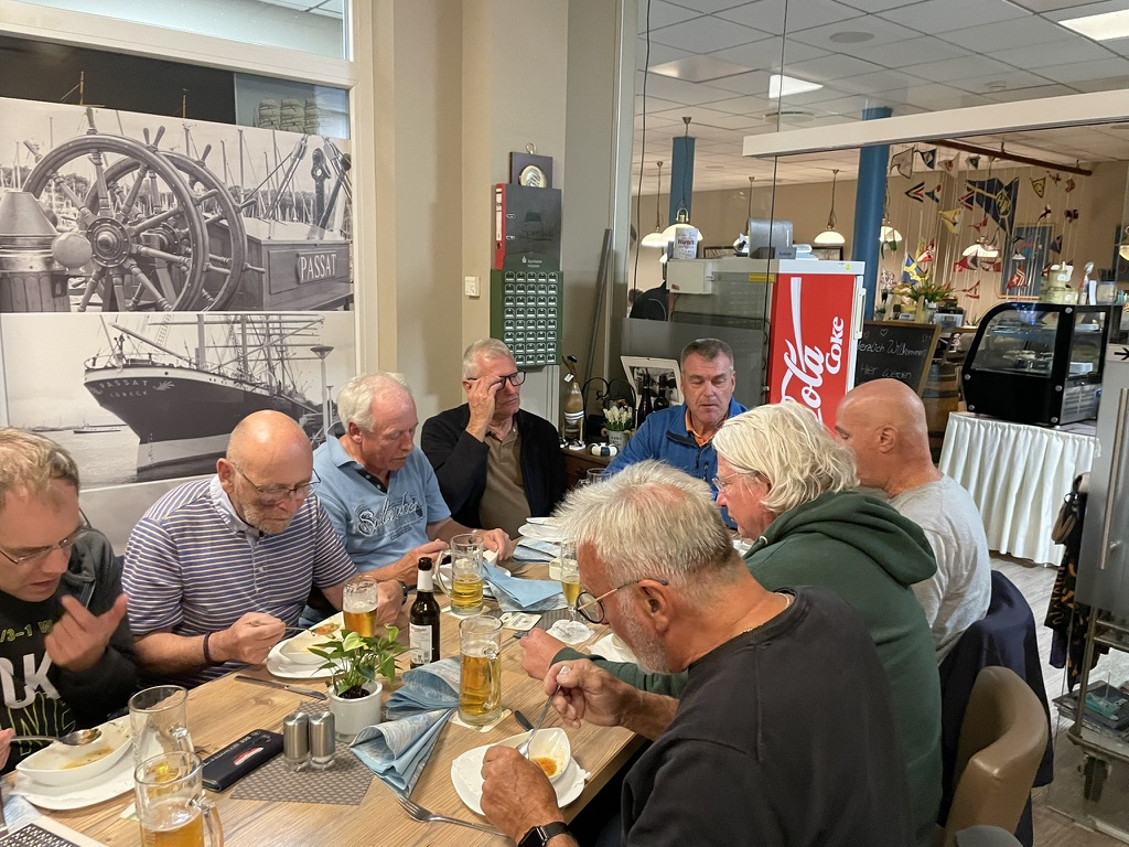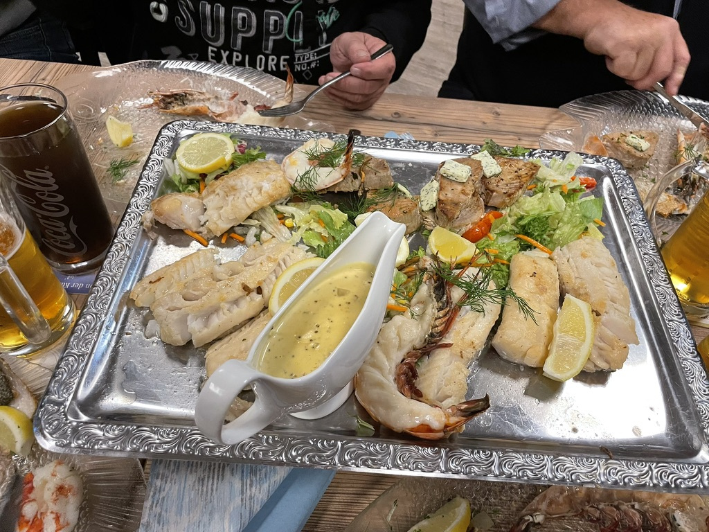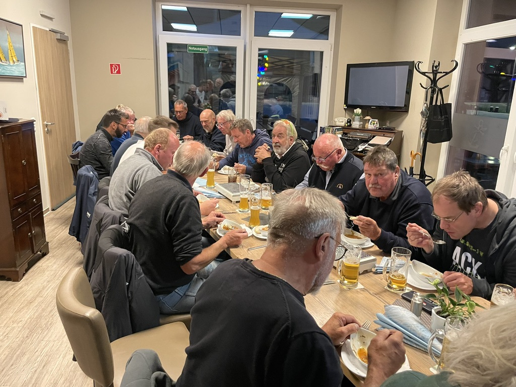 Traditionell gab es Fischplatten satt, als Vorspeise Fischsuppe und ein Überraschungsdesert zum Abschluss. Frau Grube gab alles und feierte mit uns den seglerischen Abschluss der Saison 2025.